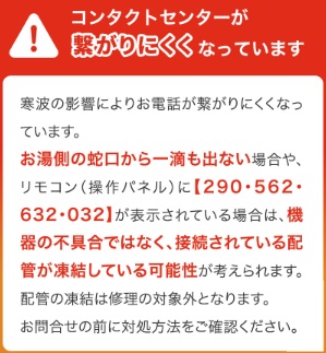 お客様によっては、給湯器など取り替えされたときに、延長保証に加入されていることがありますが、このような凍結による給湯器の不具合にメンテナンス依頼した場合は、保証対象外となり、有償になるそうですので、そちらも覚えておくとよいと思います。