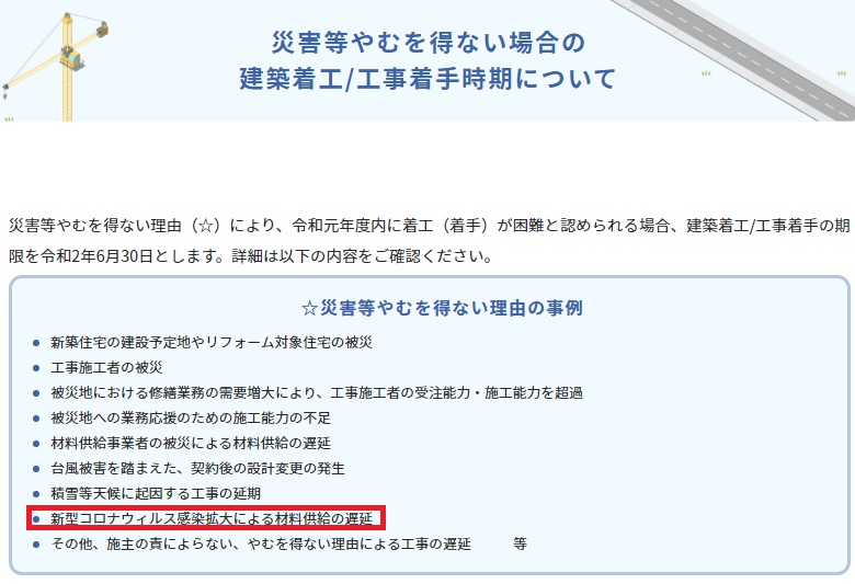 工事完了が3月末となっていて、そんなの到底間に合わないよ!ポイントの申請が出来ないじゃない!と不安だったのですが、ようやく事務局からの発表があり、やむを得ない事情で工事完了が3月末に間に合わない理由の一つに、「新型コロナウイルスの影響による工事着工・完了が遅れること」も認められることとなりました。