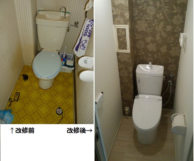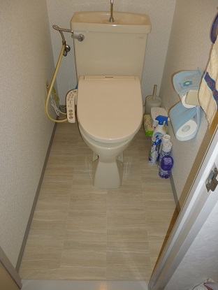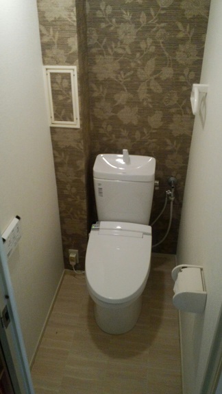 壁の一面だけ柄物のクロスを貼り、トイレ空間の雰囲気を変えてみました。