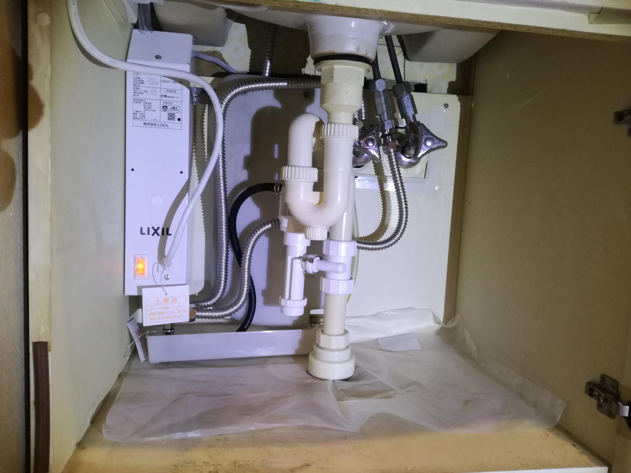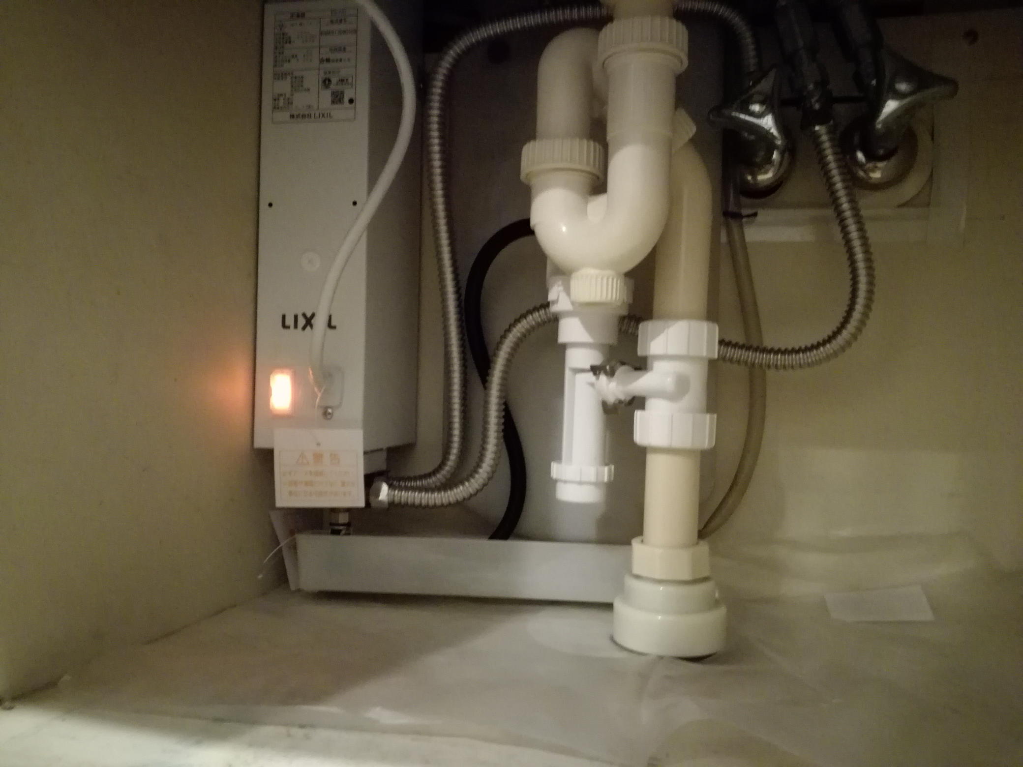 左の奥隅の小さい白い箱が電気温水器です。(こちらはLIXIL製品)