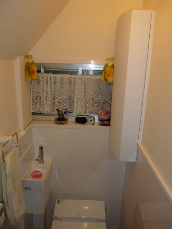 元手洗いタンクが付いていたスペースを利用して、トイレ用品の収納も取り付けました。