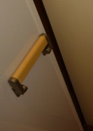 室内幅が狭いので、横手すりが常時飛び出していては出入りしにくくなるトイレでも、これなら身体に当たることなく、使うときだけ倒せばいいので便利です。