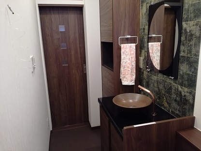 空間に合わせた設計で社長も頭を抱えていましたが、手洗いカウンターや収納を配置しました。