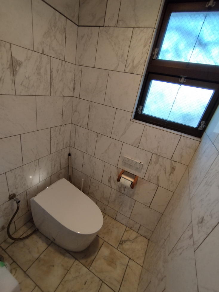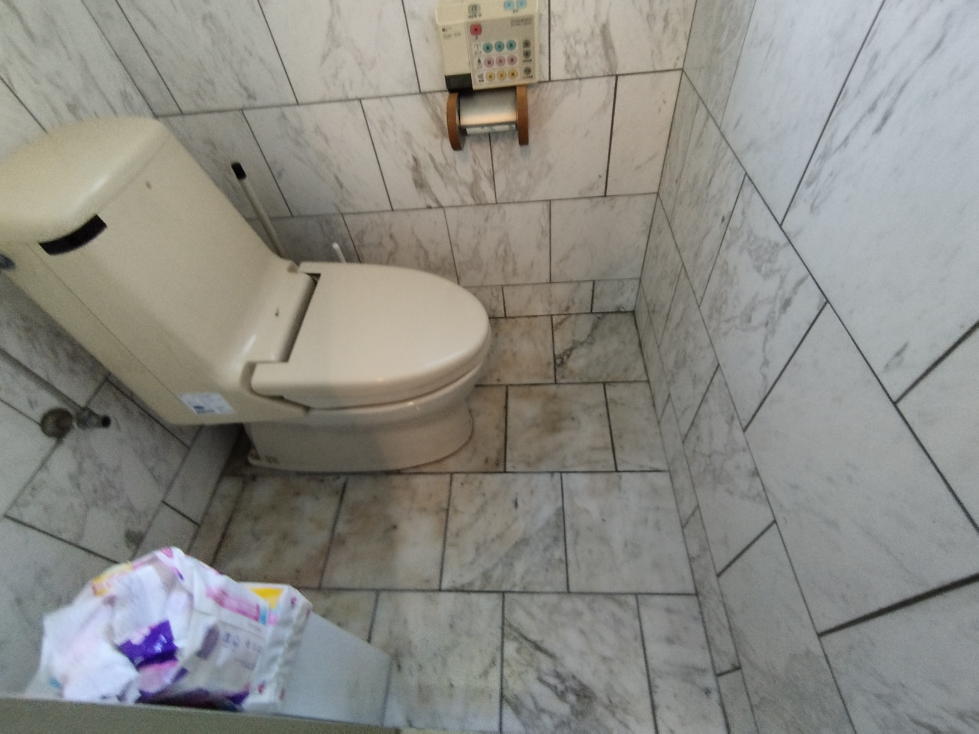 今回もLIXILの便器からTOTOの便器に取り替える際、便器の足元が短くなることがわかっていたので、設置の際に必要な「ビス穴」が見えるのを考慮し、ほんの少しだけ正規位置よりずらしての設置でした。